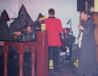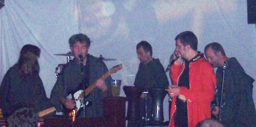 The band, all robed up, except for 18th Century renegade grenadier guardsman Bot, eased